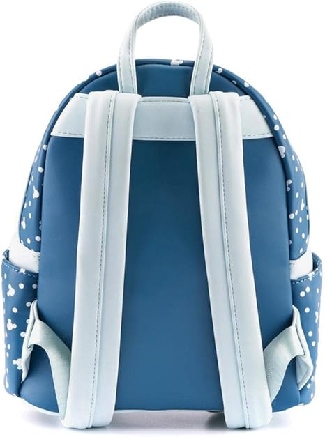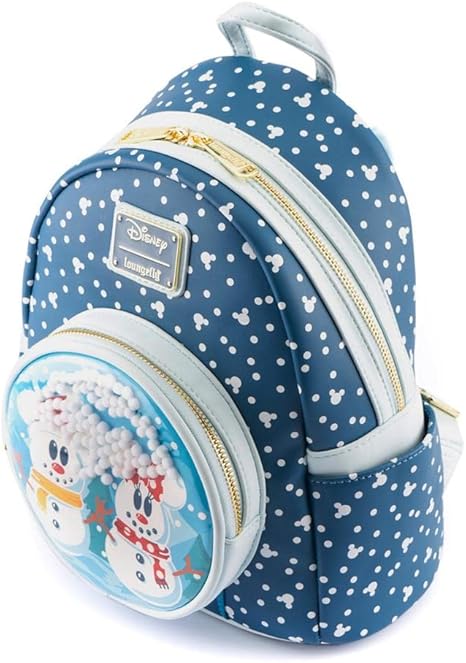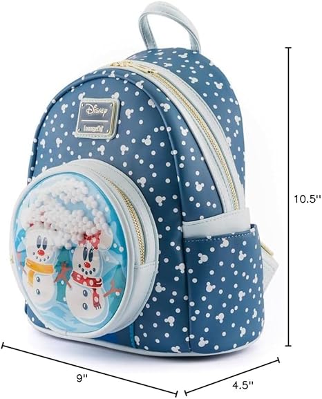 The Loungefly Disney Snowman Mickey and Minnie Mouse Snow Globe Mini Backpack is made of faux leather, PVC trim, has a top zipper closure, adjustable shoulder straps, sturdy metal hardware, matching themed lining, and features pom pom, and printed details.